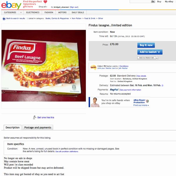 : Findus Lasagne selling on ebay for £70, The 'limited edition' horsemeat version